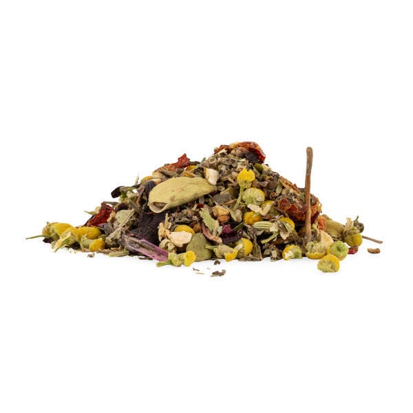 Ingrediënten: kaneel, rozenbottelschil, citrusschil, venkel, hibiscusbloesem, gember, kardemom, kamillebloesem, lindebloesem, alfalfa, zoethout, kruidnagel, zwarte peper.