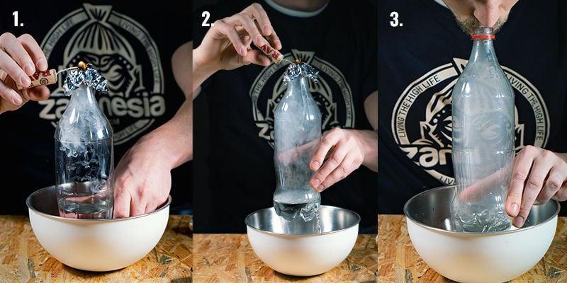 1. Houd een vlam tegen de bowl en laat het carbgat los. Het water stoomt uit de fles en trekt de rook naar binnen.
