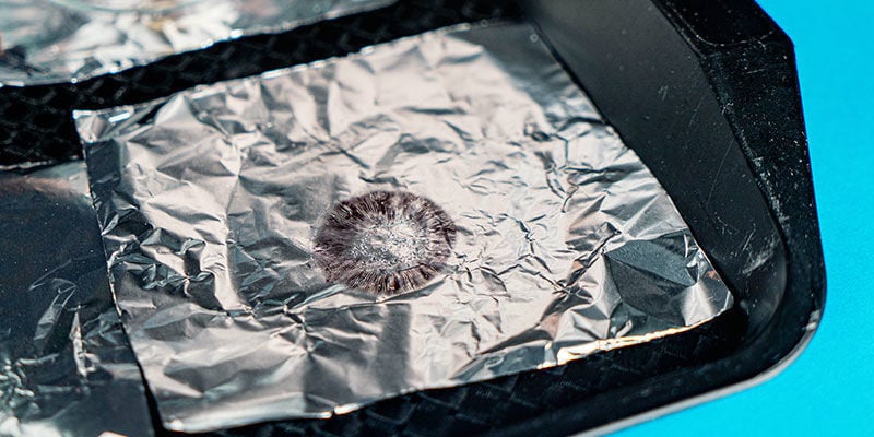 6. Indien nodig kun je het dienblad op een veilige plaats zetten en 36 uur laten staan. In die tijd vallen de sporen van de lamellen en komen ze op de folie terecht.
