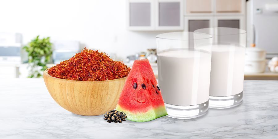5. Voeg het 'thee'-water toe aan het mengsel met het melkextract en de pasta. Voeg specerijen en rozenwater toe en daarna de rest van de warme melk met wat honing of suiker naar smaak.